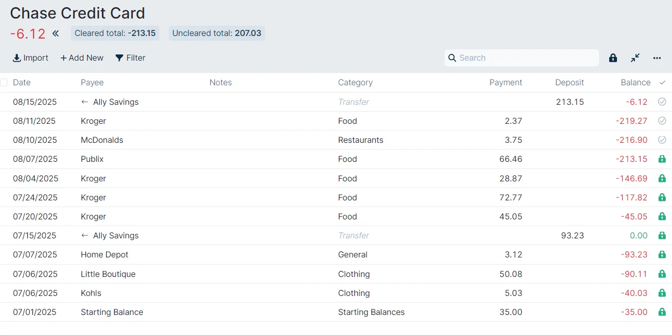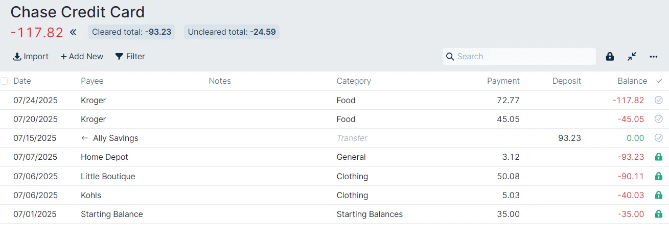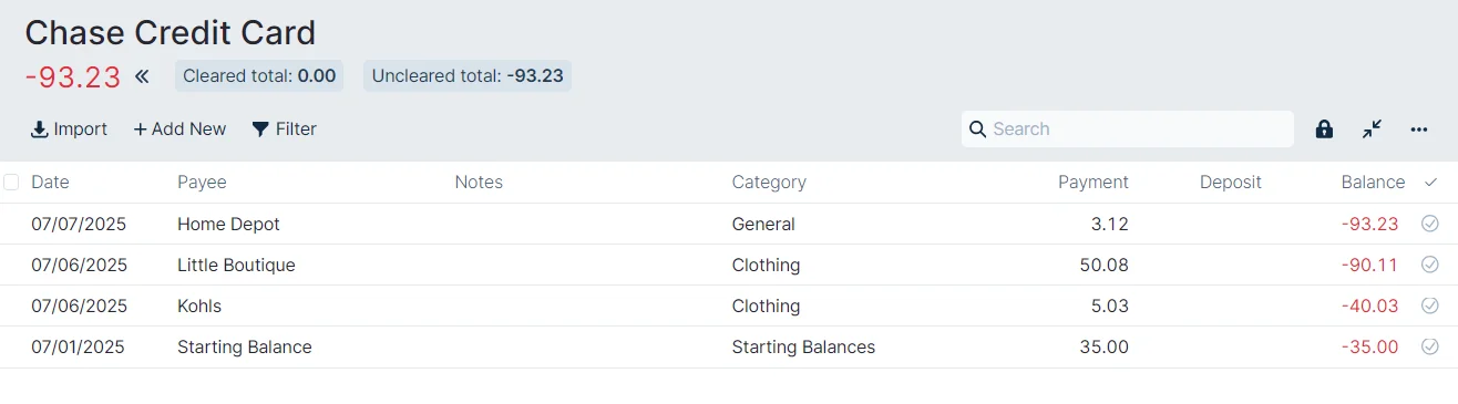 We started our budget at the beginning of July and we normally pay off our Chase Credit Card statement every month. We had some new transactions from June, so we entered a Starting Balance of $35.00.