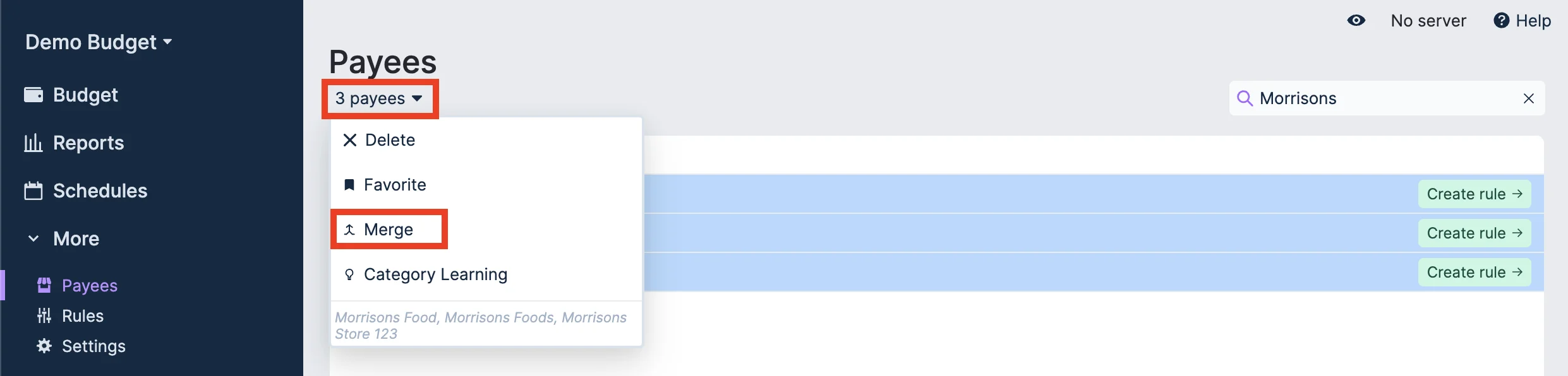 A powerful feature is merging payees. You may already have months worth of data and a lot of ugly Morrisons payees that all vary slightly. You may want to merge all of these together into one payee.